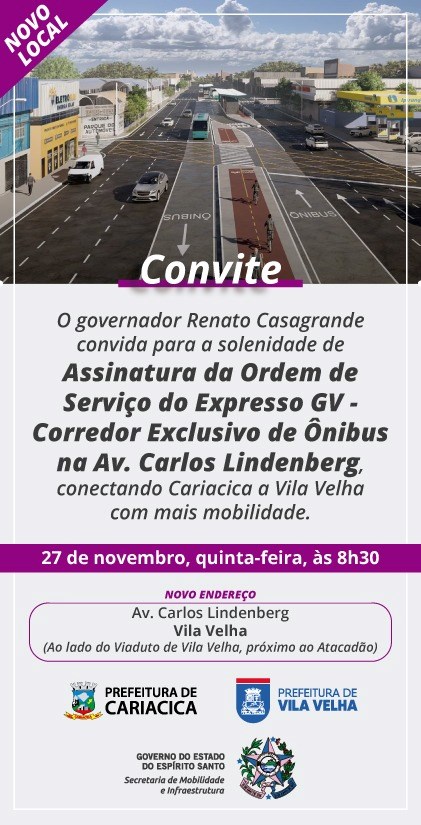 A Ordem de Serviço será assinada às 08h30 na Avenida Carlos Lindenberg, ao lado do Viaduto de Vila Velha, próximo ao Atacadão, com a presença de autoridades estaduais e municipais.