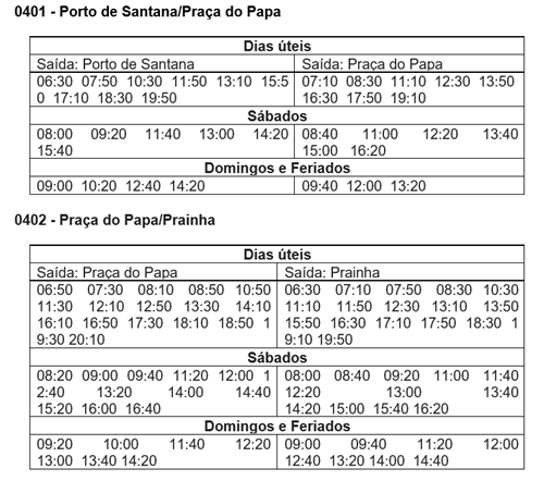 A linha 401 (Porto de Santana / Praça do Papa) vai realizar 17 viagens por dia (ida e volta) e a linha 402 (Praça do Papa / Prainha) 34 viagens (ida e volta). As lanchas têm lugar para transportar bicicletas. Uma delas tem capacidade para 86 pessoas e seis bicicletas e a outra 74 pessoas e quatro bicicletas.