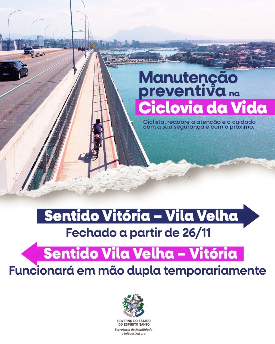 O Governo do Estado vai realizar serviços de manutenção preventiva na Ciclovia da Vida a partir da próxima terça-feira (26). O trecho no sentido Vitória a Vila Velha estará fechado temporariamente nos próximos dias para execução dos trabalhos. Durante este período, todos ciclistas vão dividir o sentido oposto, normalmente utilizado por quem sai de Vila Velha sentido Vitória.
