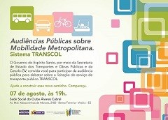 A Secretaria de Estado dos Transportes e Obras Públicas (Setop) e a Companhia de Transportes Urbanos da Grande Vitória (Ceturb-GV) convidam para a Audiência Pública, que acontece nesta quarta-feira (07), sobre o novo modelo de concessão para a prestação do serviço público de transporte coletivo das linhas da Grande Vitória, servidas pelo Sistema Transcol.